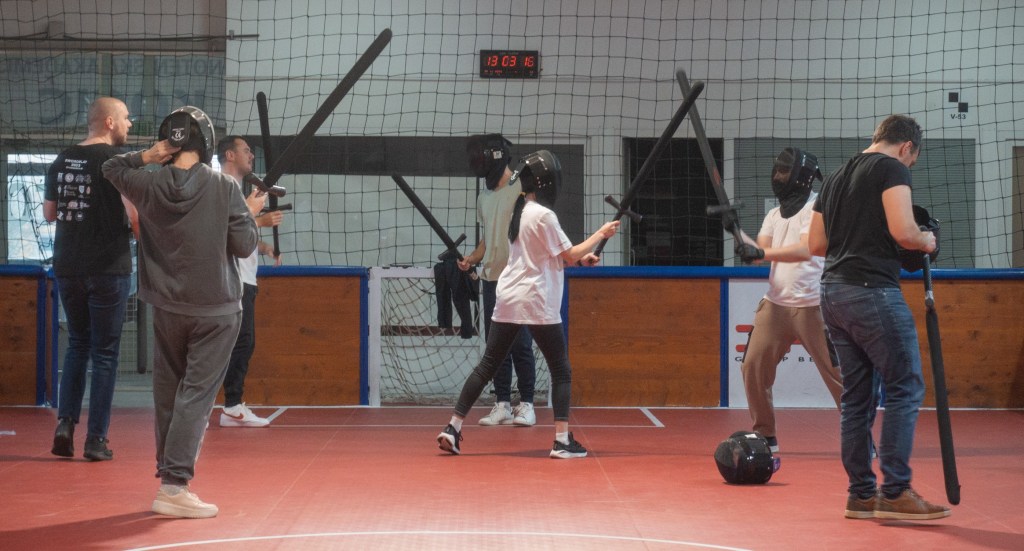 - 60 minutes of basic training, including warm-up, basics of longsword usage, and various fencing games that teach fundamentals in a fun and easy way.